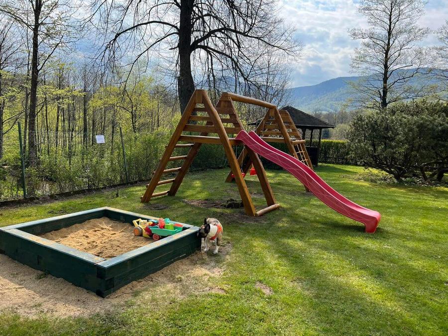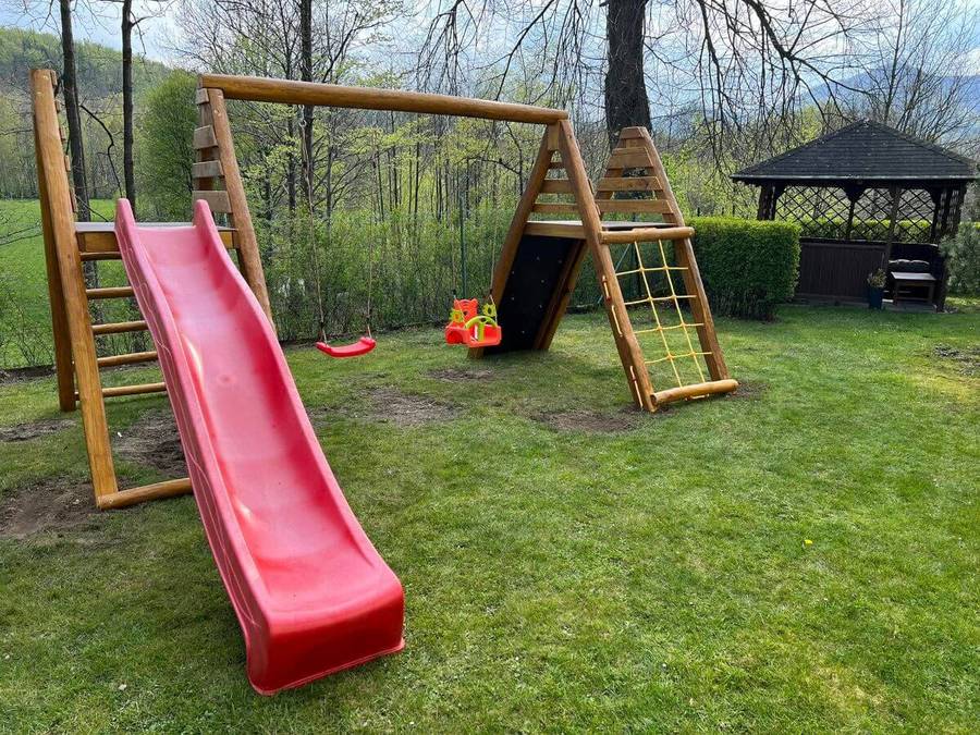 In unserem Garten gibt es einen Spielplatz mit einer Rutsche, einer Kletterwand, zwei Schaukeln und einem Sandkasten.