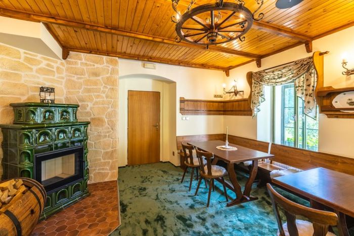 The cosy lounge, featuring a dominant tiled stove, has a capacity of approximately 20 guests.