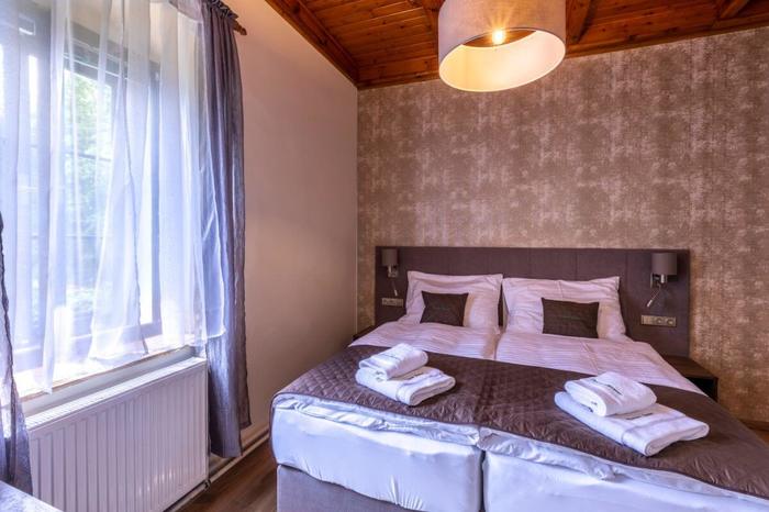 Double room number 2 is located in the main building of the guesthouse on the 1st floor. It is oriented towards southeast. This room is completely newly renovated. The view from the room is of the guesthouse garden, Jizera Mountain beech forests, a pond and the mountains. The room with a total area of 13 m² is divided into a bedroom and a spacious bathroom. It offers guests highly comfortable accommodation. The room has built-in wardrobes, space for storing luggage and clothes, a comfortable double bed with high-quality mattresses and bedside tables, a table with a minibar, a chair and a fur. Bathroom with spacious shower and wall-hung toilet completes the comfort of the room. Room amenities include a coffee set, hair dryer, towels and bath towels.