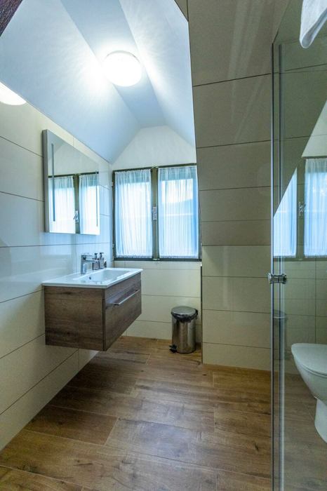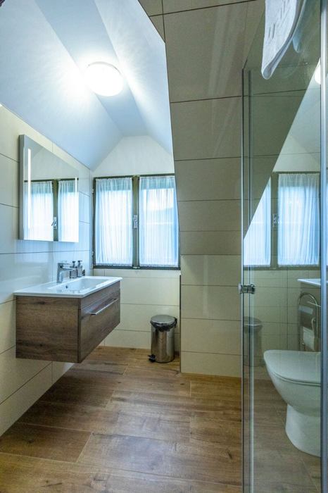 Double room number 8 with extra bed is located in the main building on the 2nd floor. It is oriented towards southeast. Room with a total area of 19 m² overlooking the garden of the guesthouse, Jizera Mountain beeches, a pond and the mountains. This room is divided into an entrance hall, a newly renovated bathroom with a shower and a toilet and a bedroom. The bedroom is equipped with a double bed with high-quality mattresses and bedside tables. The beds can be easily separated into single beds. There is a high-quality full-size extra bed available. The room is equipped with a detached wardrobe, a comfortable armchair and a table. Room amenities include a coffee set, hair dryer, towels and bath towels.