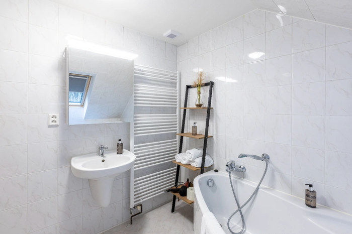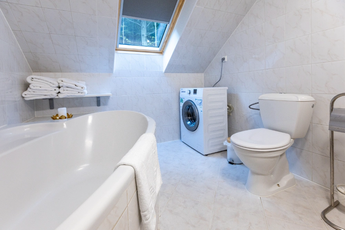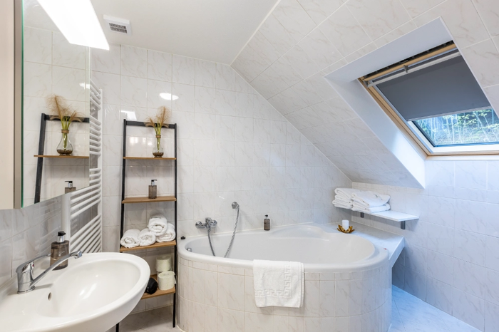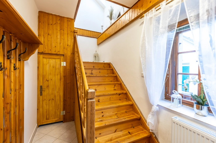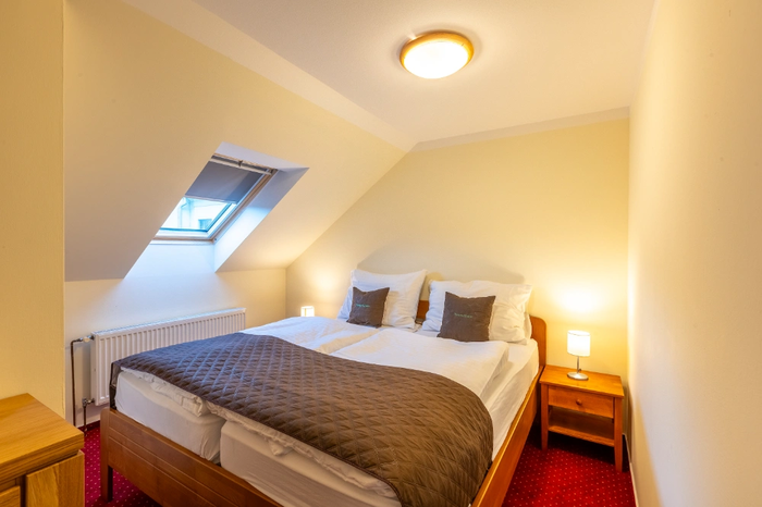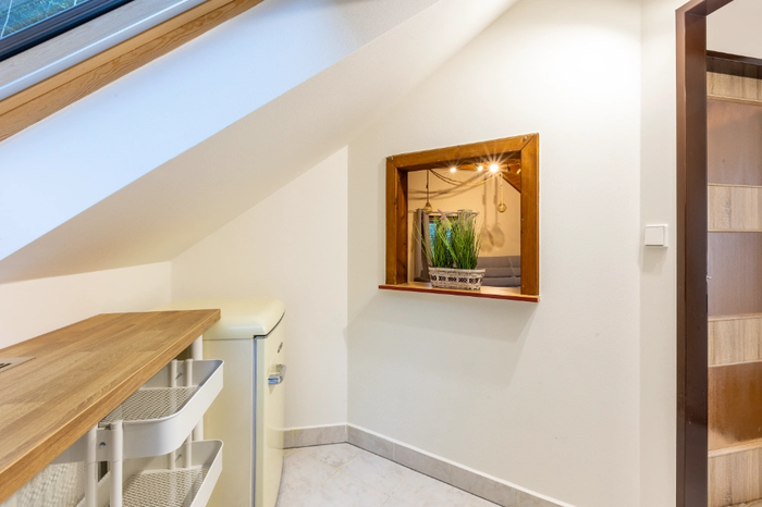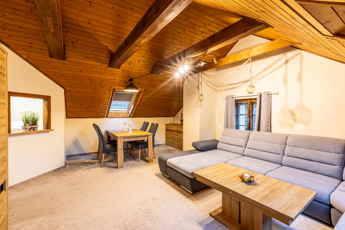 Double-bed apartment number 31 with an area of 45 m² is located on the 1st floor of a separate building with its own entrance to the forest, the Jizera Mountains and the access road. This apartment is divided into a separate entrance hallway with staircase, a bedroom with a double bed, quality mattresses and bedside tables, a living room with a large sofa bed, which if necessary serves as a full-size extra bed for two people, and a dining table. You will also find a separate equipped kitchenette with a two-burner stove, microwave, electric kettle, fridge. There is a private bathroom with a bathtub, toilet, washing machine and hairdryer. Bath sheets and towels are also included in the rooms.