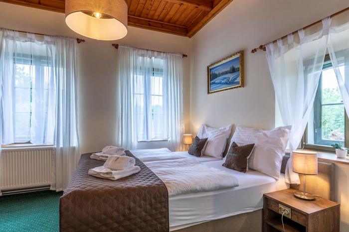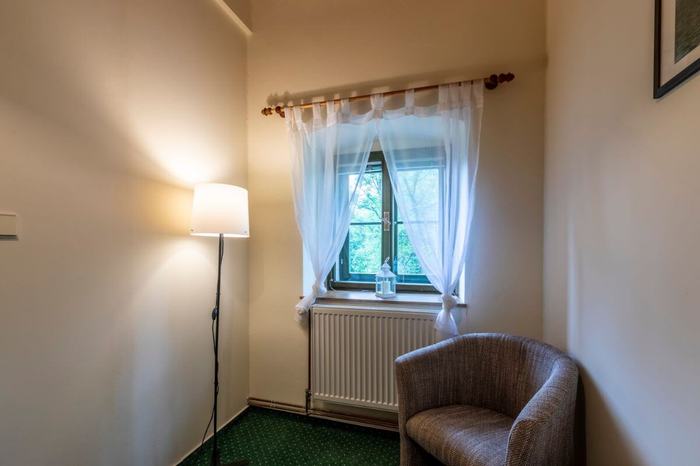 The 4-bed room number 5 is located in the main building of the guesthouse on the 1st floor. It is oriented towards northeast. A room with a total area of 29 m² overlooking the murmuring stream flowing around the guesthouse, vast pastures and forests. This room is divided into an entrance hall with a shoe rack and a coat rack, a bathroom with a shower and a toilet and two separate rooms. The first bedroom with a double bed with high-quality mattresses that can be easily separated from each other is equipped with bedside tables, a separate wardrobe, a table and a chair. This room is connected to the second bedroom, which has a large double bed that can be separated into two single beds. This bedroom is also equipped with a hotel armchair and a floor lamp. Room amenities include a coffee set, hair dryer, towels and bath towels.
