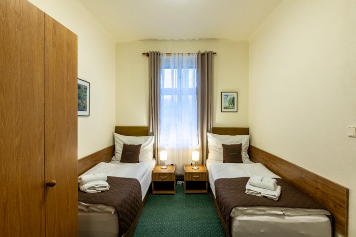 The 4-bed room number 22 with an area of 23 m² is located on the ground floor of a building called Villa with a view of the garden, the Jizera beech trees, the pond and the mountains. It is oriented towards southeast, southwest. The room has two separate bedrooms, the first of which is a walk-through. The first bedroom is equipped with two single beds with high-quality mattresses, bedside tables and a separate wardrobe and a coat rack. The second bedroom has a double bed with high-quality mattresses, bedside tables, a corner bench with a table and a sink. The bathroom has a shower and a toilet. Bath sheets and towels are also included in the rooms.