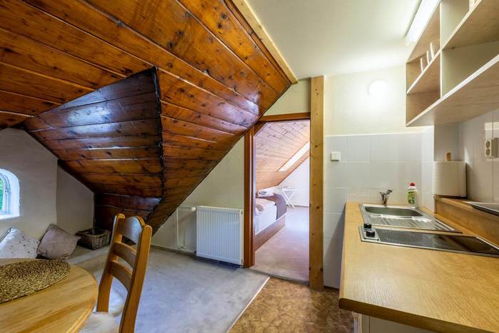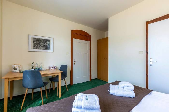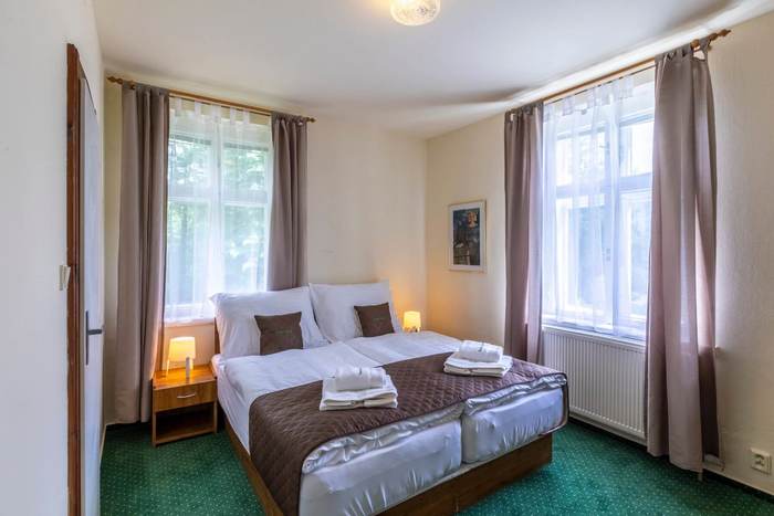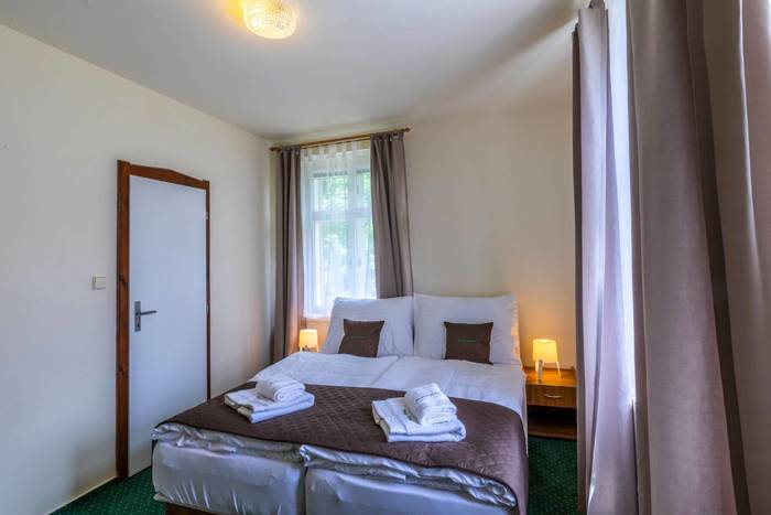 Triple wedding suite number 28 with an area of 43 m2 is located on the 2nd floor of the building called Villa with a view of the garden of the guesthouse, the Jizera Mountains beech forest, the pond and the mountains. This apartment is divided into a separate entrance hall with built-in wardrobe, bedroom with four-poster double bed with high-quality mattresses and bedside tables, sofa that serves as a full-size extra bed if necessary and a separate bed. There is also a separate equipped kitchenette with two-burner stove, microwave, electric kettle, refrigerator, dining table and chairs. There is a private bathroom with a shower and a toilet. Bath sheets and towels are also included in the rooms.