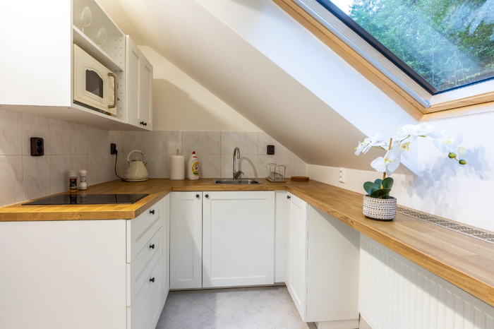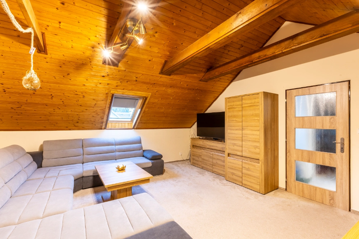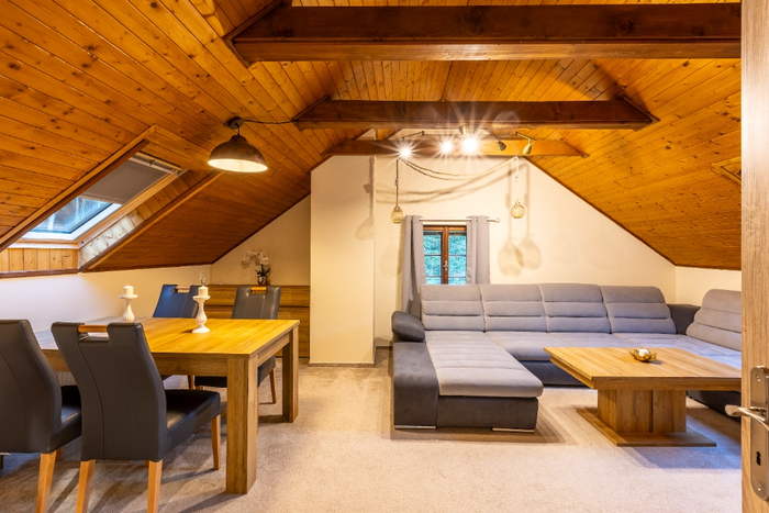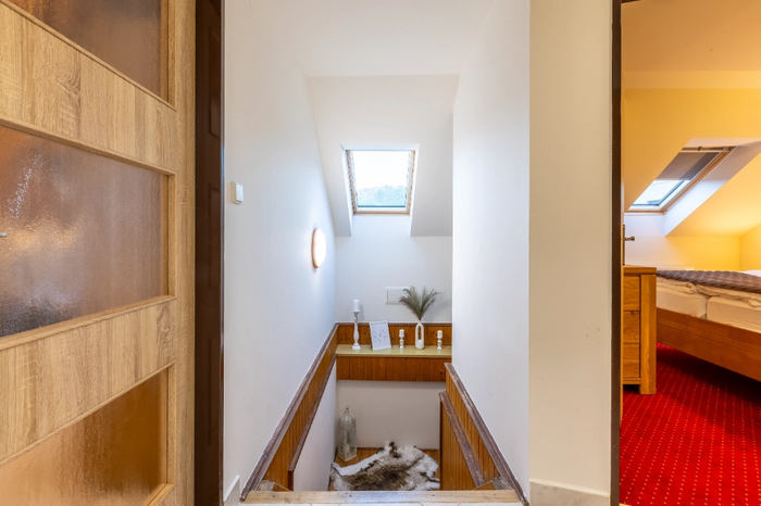Apartament dwuosobowy nr 31 o powierzchni 45 m² znajduje się na 1 piętrze oddzielnego budynku z własnym wejściem do lasu, Gór Izerskich i drogi dojazdowej. Apartament ten składa się z oddzielnego przedpokoju ze schodami, sypialni z podwójnym łóżkiem, wysokiej jakości materacami i stolikami nocnymi, salonu z dużą rozkładaną sofą, która w razie potrzeby służy jako pełnowymiarowe dodatkowe łóżko dla dwóch osób oraz stołu jadalnego. Do dyspozycji Gości jest również oddzielny aneks kuchenny z dwupalnikową kuchenką, kuchenką mikrofalową, czajnikiem elektrycznym i lodówką. Do dyspozycji Gości jest łazienka z wanną, toaletą, pralką i suszarką do włosów. Ręczniki i ręczniki kąpielowe są zapewnione.