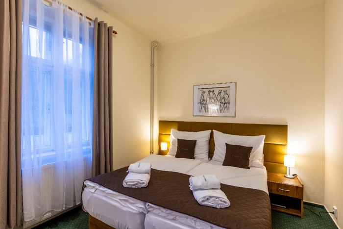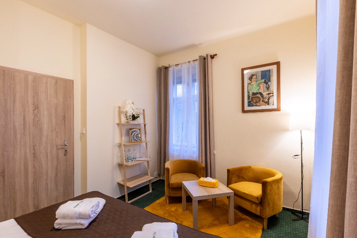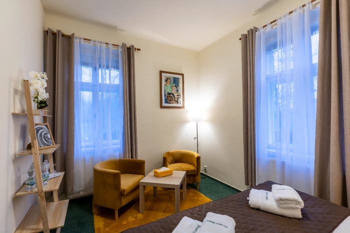 Pokój czteroosobowy nr 22 o powierzchni 23 m² znajduje się na parterze budynku o nazwie Vila z widokiem na ogród, buki Gór Izerskich, staw i góry. Orientacja PW, PZ. Pokój ma dwie oddzielne sypialnie, z których pierwsza jest przechodnia. Pierwsza sypialnia wyposażona jest w dwa pojedyncze łóżka z wysokiej jakości materacami, szafki nocne oraz oddzielną szafę i wieszak. W drugiej sypialni znajduje się podwójne łóżko z wysokiej jakości materacem, szafki nocne, narożna ława ze stolikiem i umywalka. W łazience znajduje się prysznic i toaleta. Ręczniki i ręczniki kąpielowe są zapewnione.
