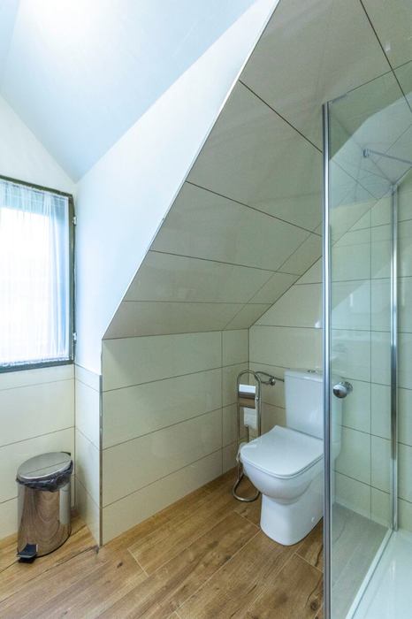 Pokój dwuosobowy nr 8 z dodatkowym łóżkiem znajduje się w budynku głównym na 2. piętrze. Orientacja PZ. Pokój o łącznej powierzchni 19 m² z widokiem na ogród pensjonatu, buki Gór Izerskich, staw i góry. Pokój ten składa się z przedpokoju, odnowionej łazienki z prysznicem i toaletą oraz sypialni. Sypialnia wyposażona jest w podwójne łóżko z wysokiej jakości materacem i szafki nocne. Łóżka można łatwo rozdzielić na pojedyncze. Dostępne jest wysokiej jakości pełnowymiarowe dodatkowe łóżko. Pokój wyposażony jest w wolnostojącą szafę, wygodny fotel i stolik. Wyposażenie pokoju obejmuje zestaw do parzenia kawy, suszarkę do włosów, ręczniki i ręczniki kąpielowe.