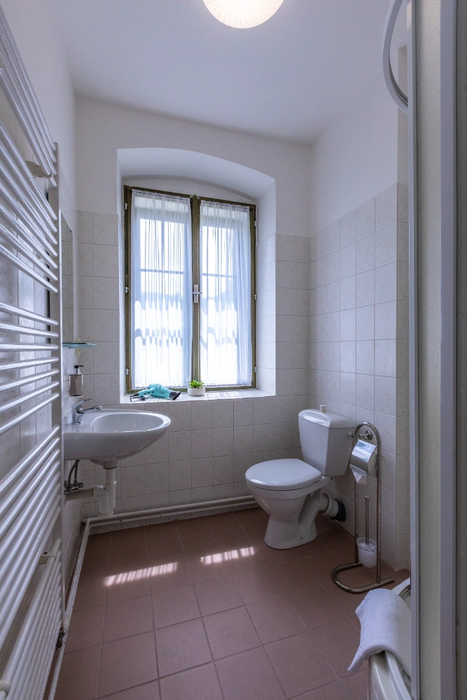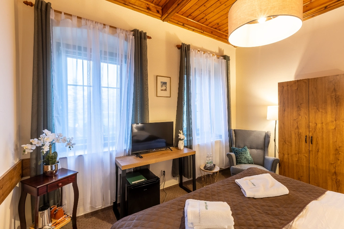 Pokój dwuosobowy nr 4 znajduje się w budynku głównym na 1. piętrze. Orientacja PW, PZ. Pokój o łącznej powierzchni 14 m² z widokiem na ogród pensjonatu, buki Gór Izerskich, staw, góry i szumiący potok przepływający obok pensjonatu. Pokój podzielony jest na przedpokój z półką na buty i wieszakiem, łazienkę z prysznicem i toaletą oraz oddzielną sypialnię. Sypialnia wyposażona jest w podwójne łóżko z wysokiej jakości materacem i szafkami nocnymi, szafę, wygodny fotel, lampę podłogową i stolik. Łóżka w pokoju można łatwo rozdzielić. Wyposażenie pokoju obejmuje zestaw do parzenia kawy, suszarkę do włosów, ręczniki i ręczniki kąpielowe.