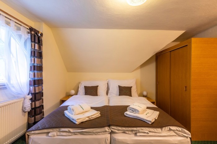 Pokój dwuosobowy nr 27 o powierzchni 12 m² znajduje się na 2 piętrze budynku zwanego Willą z widokiem na ogród pensjonatu i buki izerskie. Orientacja Z. W pokoju znajduje się sypialnia z łóżkiem małżeńskim z wysokiej jakości materacem i stolikami nocnymi, szafą wnękową, stołem z krzesłami, umywalką i wieszakiem. Własna, zamykana łazienka znajduje się na zewnątrz pokoju, na pierwszym piętrze, tuż pod schodami i wyposażona jest w prysznic, umywalkę i toaletę. Ręczniki kąpielowe i ręczniki kąpielowe stanowią część wyposażenia pokoju.