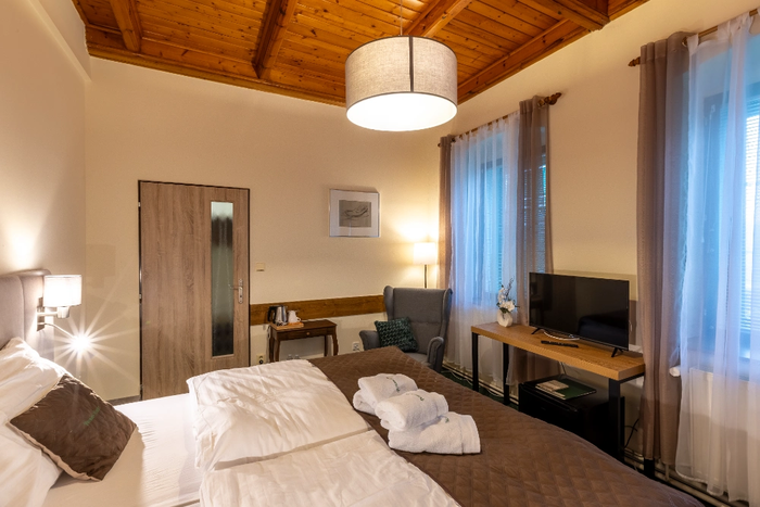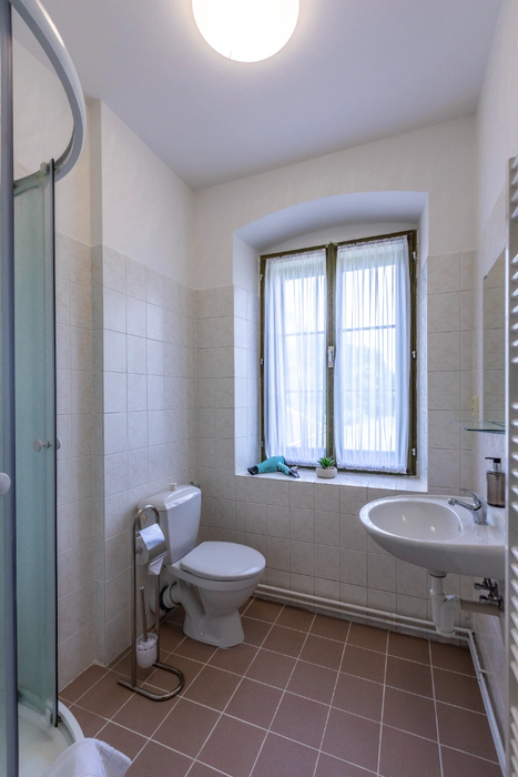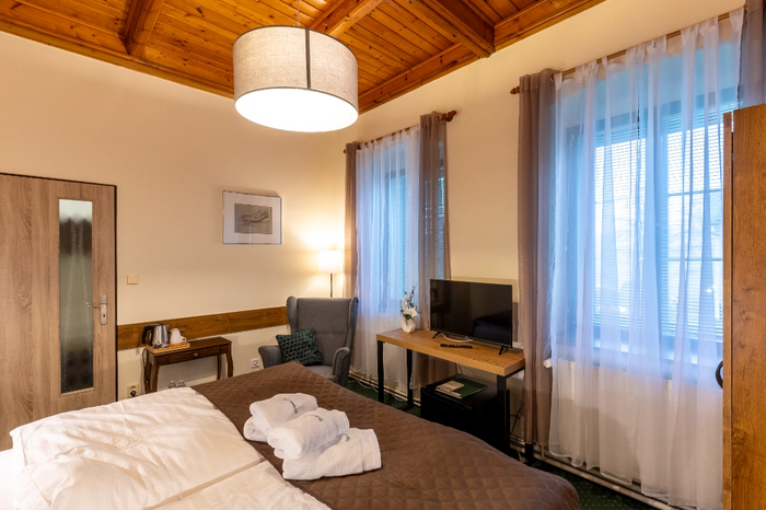 Czteroosobowy apartament nr 9 z możliwością dostawki znajduje się w budynku głównym na 2 piętrze. Orientacja P, W, P. Jest perłą naszego pensjonatu. Mieszkanie o łącznej powierzchni 60 m² podzielone jest na przedpokój, dwie oddzielne sypialnie, wspólny salon z aneksem kuchennym i balkonem oraz łazienkę z wanną, prysznicem, bidetem i toaletą. Z apartamentu roztacza się panoramiczny widok na trzy strony świata, na otaczającą przyrodę, na ogród pensjonatu, buki izerskie, staw, góry, bulgoczący, meandrujący potok, rozległe pastwiska i lasy. Pierwsza sypialnia wyposażona jest w dwa pojedyncze łóżka z wysokiej jakości materacami, które można łatwo połączyć w łóżko podwójne, szafę, stół i krzesło. Druga sypialnia wyposażona jest w podwójne łóżko z wysokiej jakości materacem oraz szafki nocne. Łóżka te można łatwo rozdzielić na dwa osobne łóżka. W sypialni znajduje się również drewniana komoda i wieszak. We wspólnym salonie znajduje się rozkładana sofa, która służy również jako dodatkowe łóżko, wygodny fotel, lampa podłogowa, drewniany kredens oraz w pełni wyposażony aneks kuchenny z lodówką, kuchenką mikrofalową, piekarnikiem, kuchenką dwupalnikową i czajnikiem. Ten apartament zapewni Ci maksymalny komfort. W apartamencie znajduje się zestaw do kawy, suszarka do włosów, ręczniki oraz ściereczki kuchenne.
