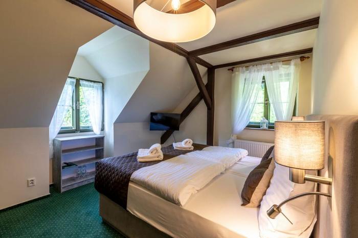 Pokój czteroosobowy nr 7 znajduje się w budynku głównym na 2. piętrze. Orientacja PZ. Pokój ma łączną powierzchnię 24 m² i roztacza się z niego widok na wejście do pensjonatu, ogród pensjonatu, buki Gór Izerskich, staw i góry. Pokój jest podzielony na przedpokój, łazienkę z prysznicem i toaletą oraz dwa oddzielne pokoje. Pierwsza sypialnia z podwójnym łóżkiem z wysokiej jakości materacem i szafkami nocnymi, które można łatwo oddzielić, wyposażona jest w wieszak, dwa krzesła hotelowe, mały stolik i niską szafkę. W drugiej sypialni znajdują się dwa podwójne łóżka, które można łatwo połączyć w łóżko podwójne, a także krzesło i oddzielna szafa. Wyposażenie pokoju obejmuje zestaw do parzenia kawy, suszarkę do włosów, ręczniki i ręczniki kąpielowe.