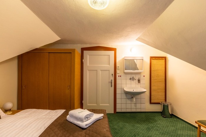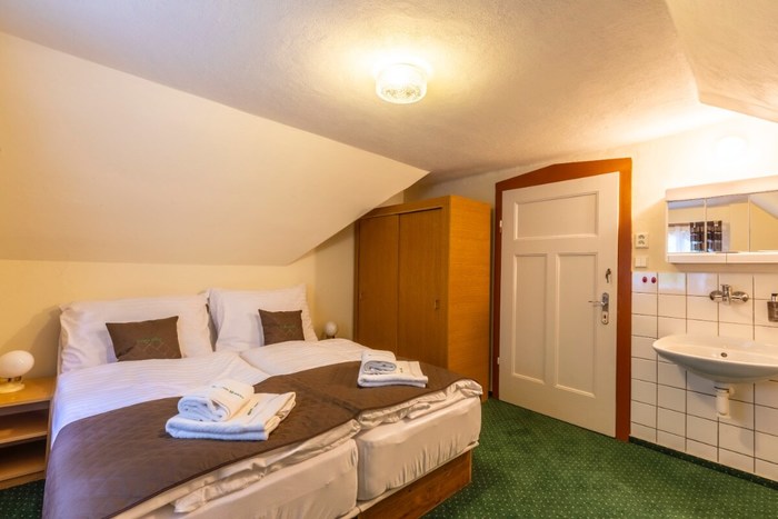 Das Doppelzimmer Nr. 27 mit einer Fläche von 12 m² befindet sich im 2. Stock der Villa mit Blick auf den Garten der Pension und die Isergebirgsbuchen. Orientierung W. Das Zimmer hat ein Schlafzimmer mit einem Doppelbett mit Qualitätsmatratze und Nachttischen, Einbauschrank, Tisch mit Stühlen, Waschbecken und Kleiderbügel. Das eigene, abschließbare Badezimmer befindet sich neben dem Zimmer im 1. Stock direkt unter der Treppe und ist mit einer Dusche, einem Waschbecken und einer Toilette ausgestattet. Handtücher und Badetücher sind vorhanden.