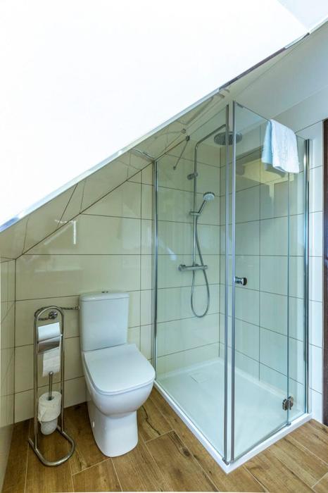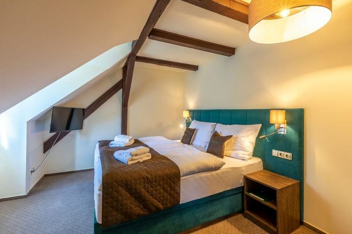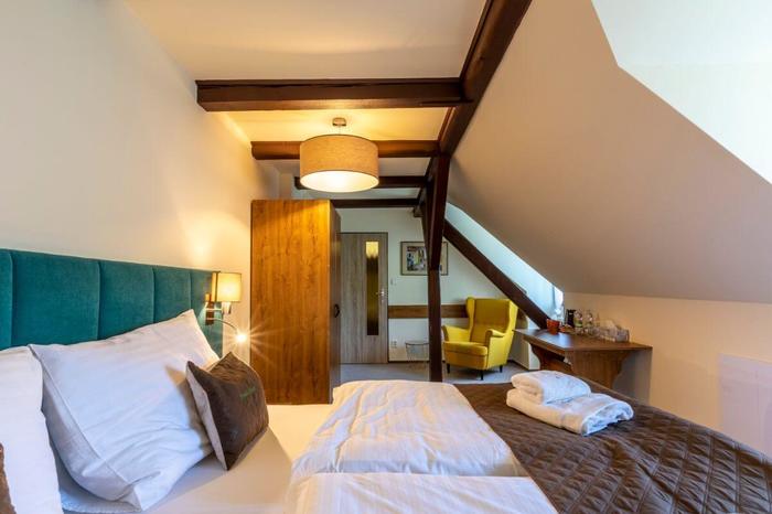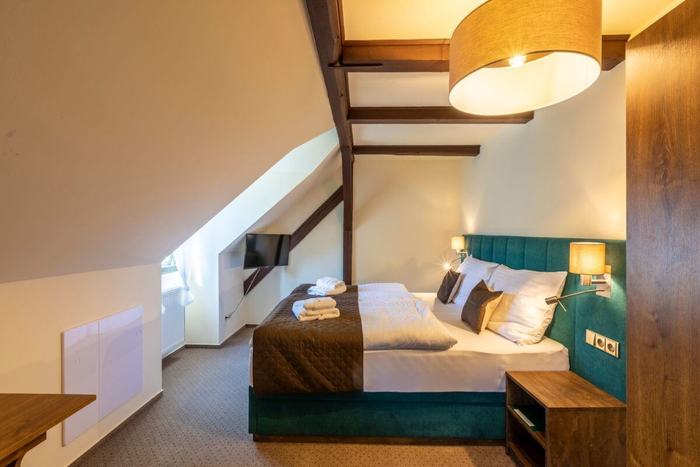 Das Doppelzimmer Nummer 8 mit Zusatzbett befindet sich im Hauptgebäude der Pension auf der 2. Etage. Orientierung SW. Zimmer mit einer Gesamtfläche von 19 m² mit Blick auf den Garten der Pension, die Buchen des Isergebirges, den Teich und die Berge. Dieses Zimmer ist aufgeteilt in einen Vorraum, ein Badezimmer mit Dusche und WC und ein Schlafzimmer. Das Schlafzimmer ist mit einem Doppelbett mit hochwertigen Matratzen und Nachttischen ausgestattet. Die Betten können leicht in separate Betten voneinander getrennt werden. Es ist ein hochwertiges komplettes Zusatzbett verfügbar. Das Zimmer ist mit einem freistehenden Kleiderschrank, einem bequemen Sessel und einem Schreibtisch ausgestattet. Zur Zimmerausstattung gehören ein Kaffeeset, ein Haartrockner, Handtücher und Badelaken.