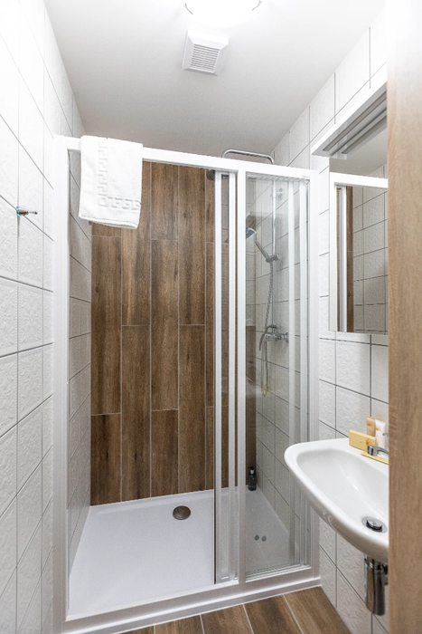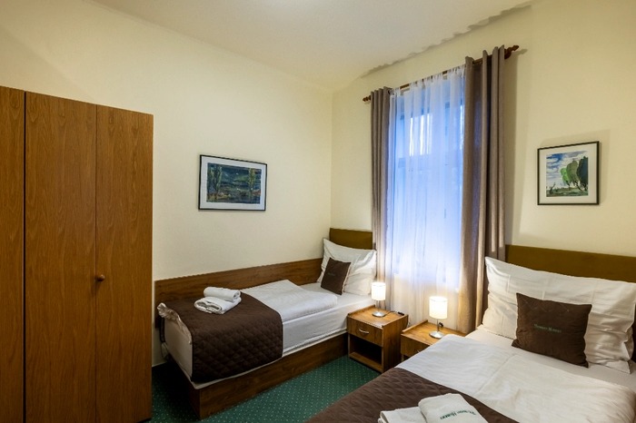 Das Vierbettzimmer Nummer 22 mit einer Fläche von 23 m² befindet sich im Erdgeschoss der Villa mit Blick auf den Garten, die Isergebirgsbuchen, den Teich und die Berge. Ausrichtung SE, SW. Das Zimmer hat zwei getrennte Schlafzimmer, von denen das erste ein Durchgangszimmer ist. Das erste Schlafzimmer ist mit zwei Einzelbetten mit hochwertigen Matratzen, Nachttischen und einem separaten Kleiderschrank mit Kleiderbügeln ausgestattet. Das zweite Schlafzimmer hat ein Doppelbett mit hochwertigen Matratzen, Nachttische, eine Eckbank mit Tisch und ein Waschbecken. Das Badezimmer hat eine Dusche und eine Toilette. Handtücher und Badetücher sind vorhanden.